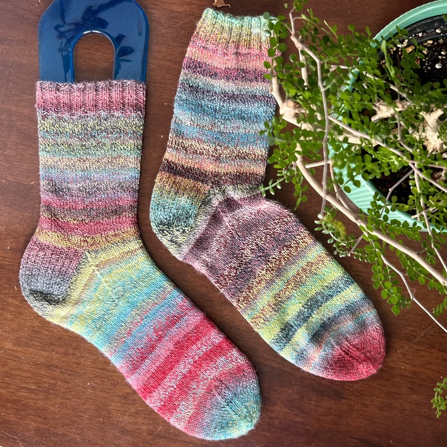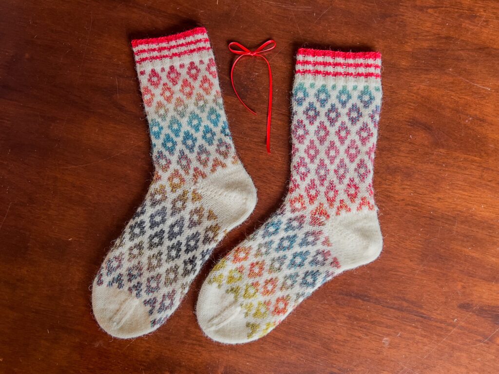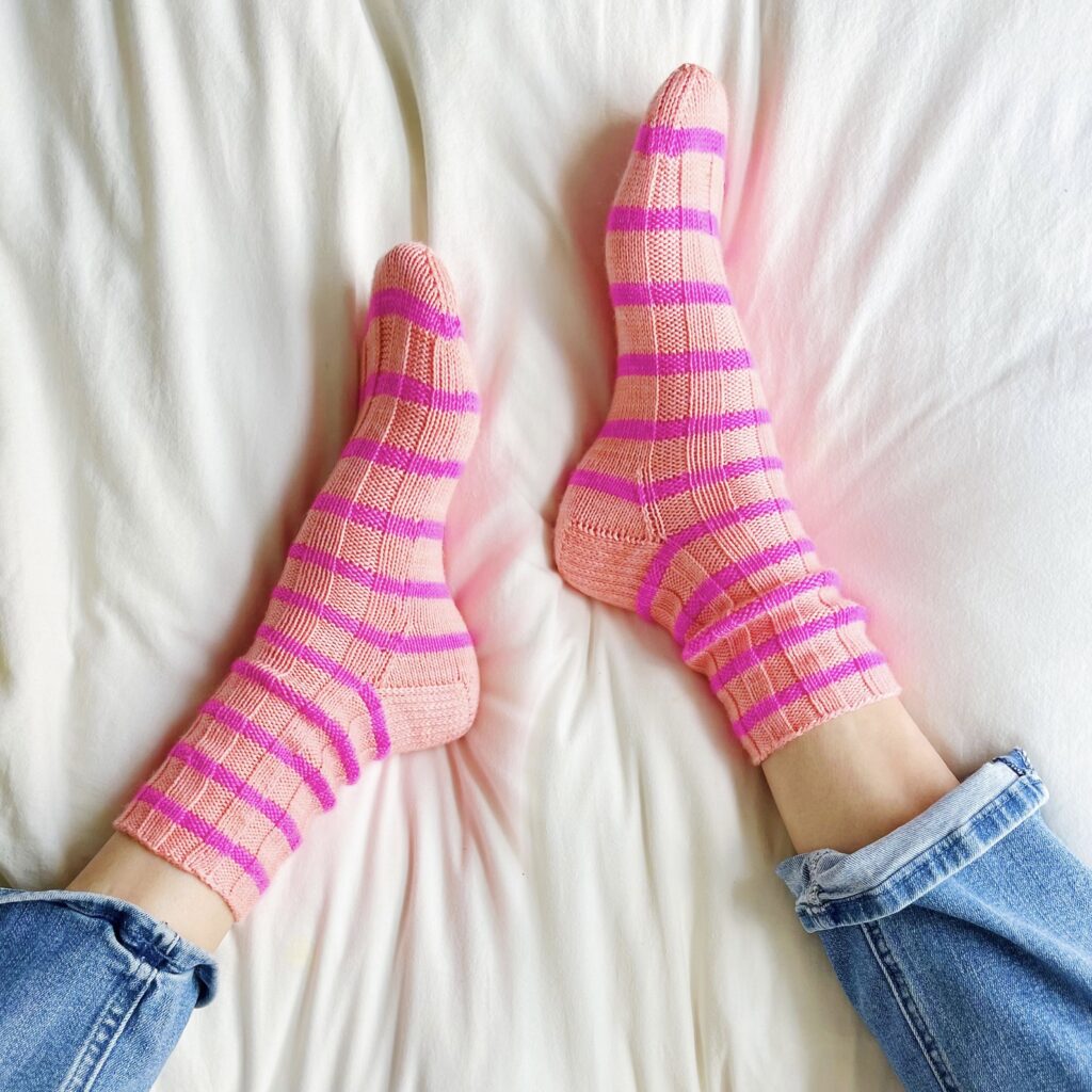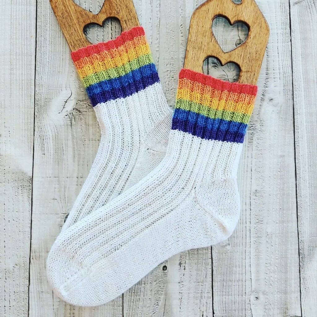 Když se s proužky rozjedete, je těžké zastavit. Ale jestli to zvládnete, mám pro vás tipy na dva designy, které už nejpíš dobře znáte, protože jsem je oba pletla loni v rámci KALu. Prvním jsou 1977 socks od Marie Honzíkové a druhým moje ponožky Zahrada. Na pár proužcích u lemu totiž něco je. 🙂 Ponožky od Marie si mají v originále tři pruhy, ale chci vám ukázat ještě duhovou variantu od Emmie Makes.