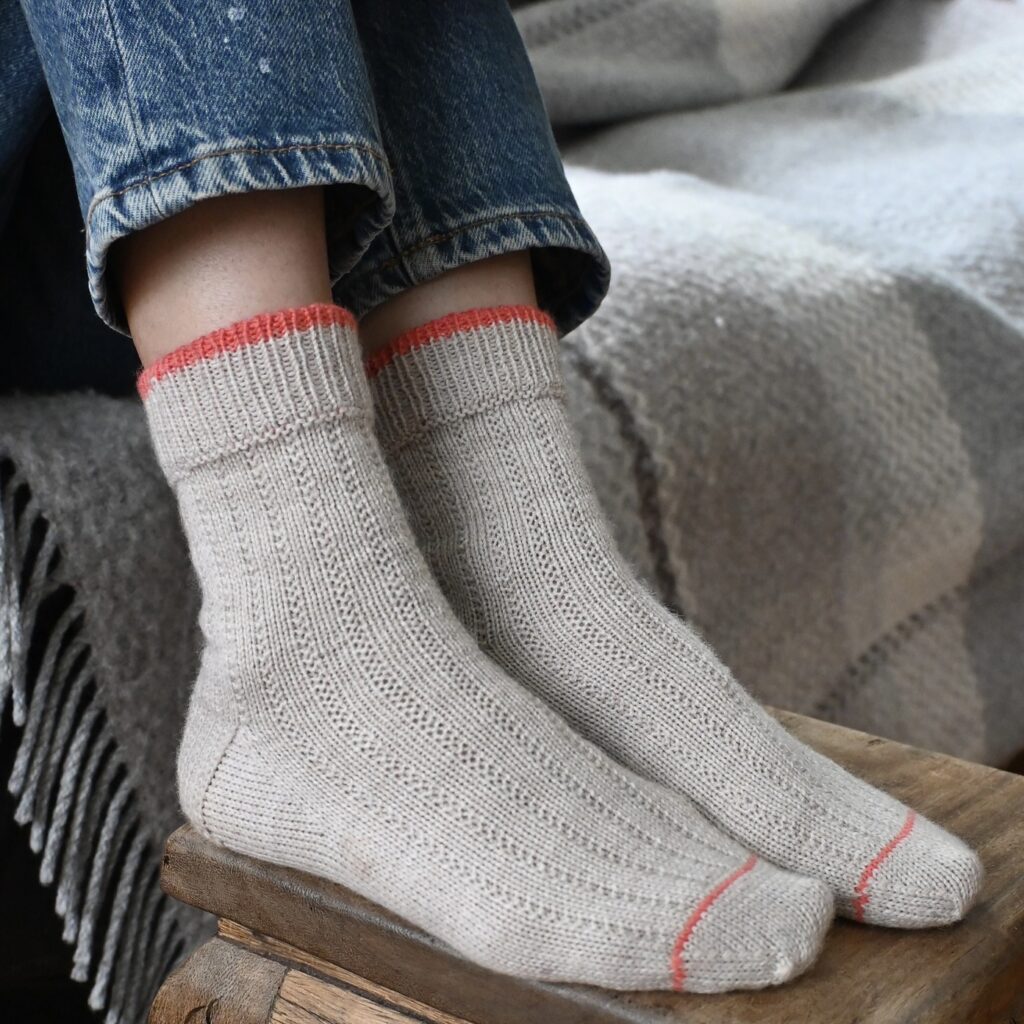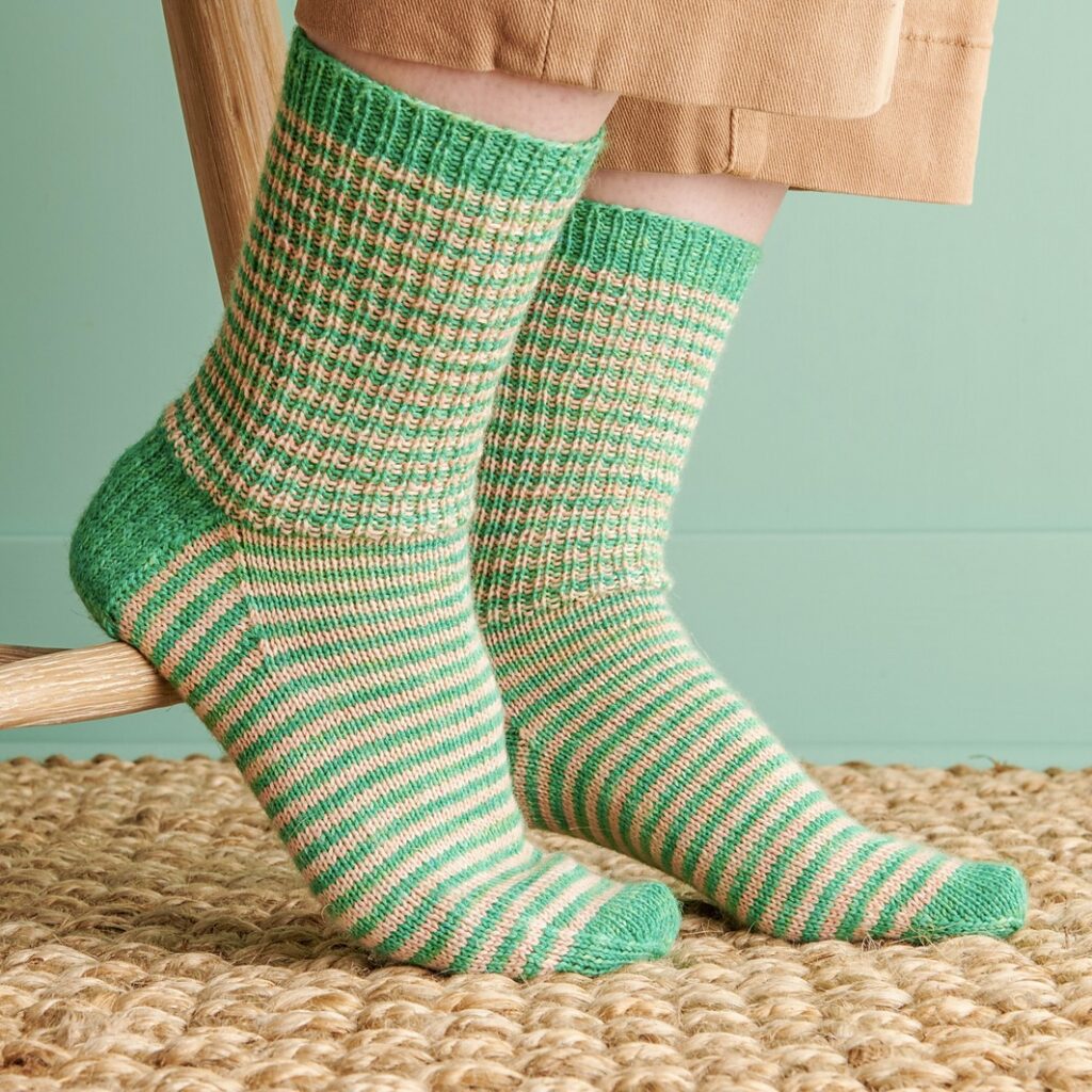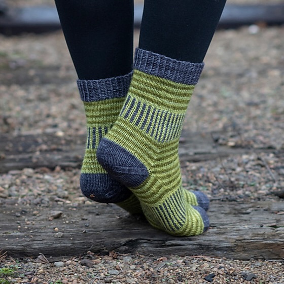 Někdy stačí šikovně umístěný jeden proužek, který přidá ponožkám šmrnc. Napadlo mě to, když jsem viděla poslední návod od Andrey Mowry na Oxbow Socks. Budou se dobře plést a stačí jen linka nahoře a kontrastní špička, aby byly zajímavé. Podobné ponožky s jemným proužkem jsou i Sucre a la creme od Tricot Design MCL.