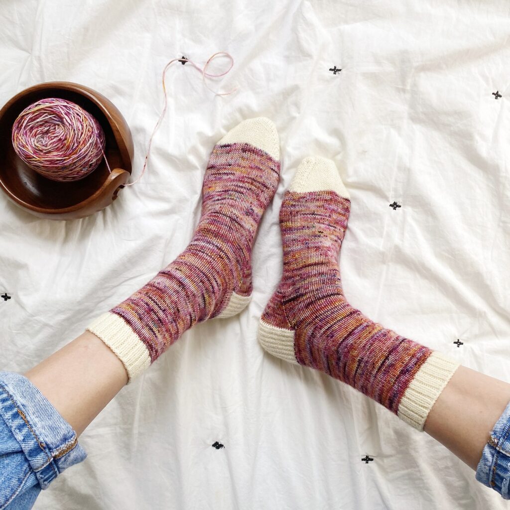 V knížce 52 Weeks of Easy Knits ozvláštnila designérka Sini Kramer jednoduchý design Lemonade Socks jen posunutím druhé barvy o pár řad pod lem. Dvoubarevné jsou i oblíbené ponožky I’m So Basic Socks od designérky Summer Lee. Návod je zadarmo a navíc je k němu plno tipů a videí.