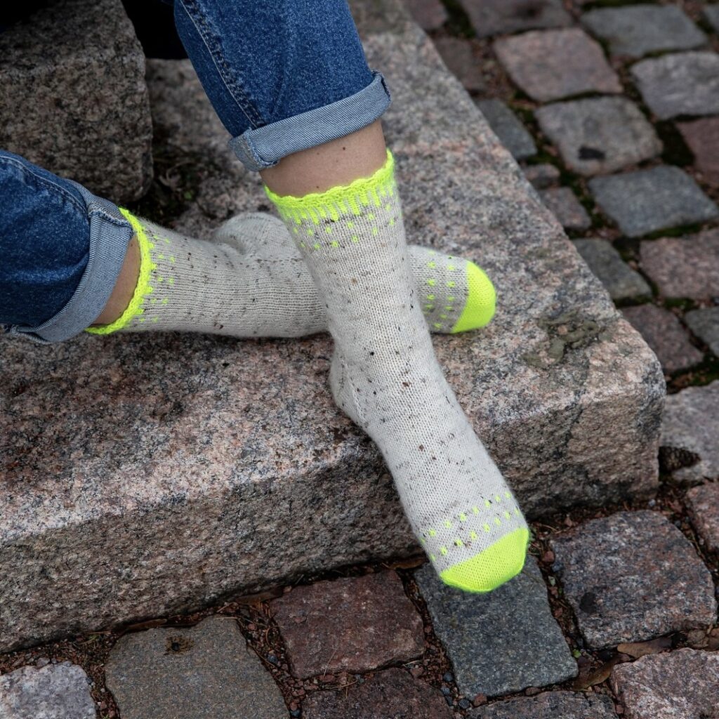 Ponožky Lucky Girl Socks s neonovým lemem a špičkou vyšly v druhém díle 52 Weeks of Socks. Zdarma je návod na ponožky Sank od Lotty H. Löthgren. Kontrast a miniaturní nopky přidala Morgan Panich k ponožkám A Frame (v návodu jsou i roztomilé dětské velikosti) a Aimee Sheer zase k ponožkám Boba Time Socks.