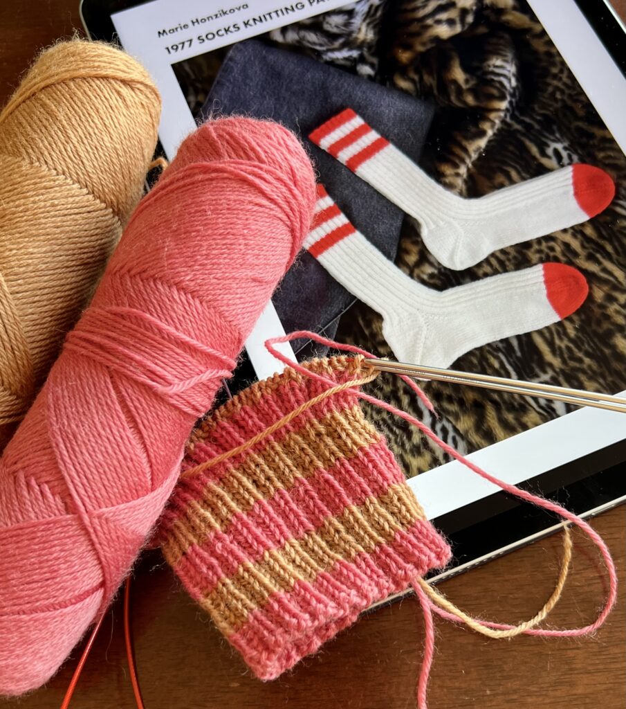 Já jsem si do KALu vybrala design 1977 socks od své kamarádky a české designérky Marie Honzíkové. Líbí se mi jejich sedmdesátkový retro styl, ale hlavně jsem je pletla kvůli patě. Marie šla s kůží na trh a v návodu sdílela rodinné tajemství. Konstrukci paty, kterou vymyslela její máma Markéta a kterou nikdo jiný na světě neplete. To jsem si nemohla nechat ujít!