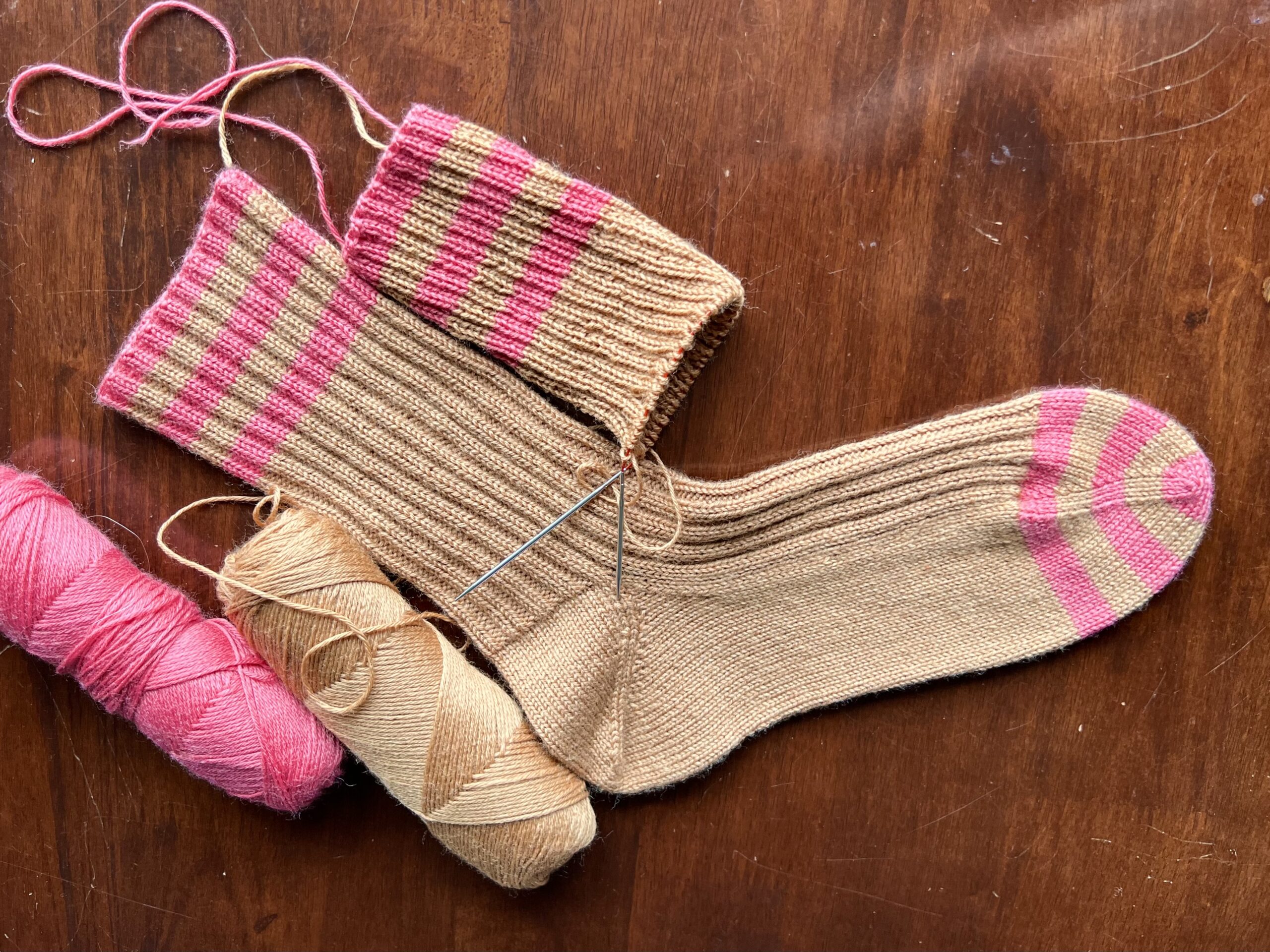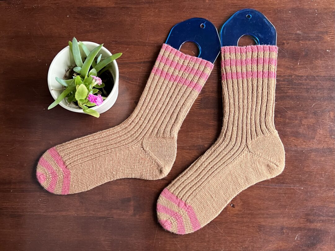 Vybrala jsem doporučenou přízi Arwettu od Filcolany. Hnědá a růžová na mě mrkly, když jsem ve Woolpointu vybírala přízi na svetr. Trochu jsem se bála, že barvy nebudou mít dostatečný kontrast, ale natolik se mi líbily, že jsem je nemohla pustit z hlavy. Proužky na ponožkách jsou nakonec dost široké, aby snesly menší kontrast.