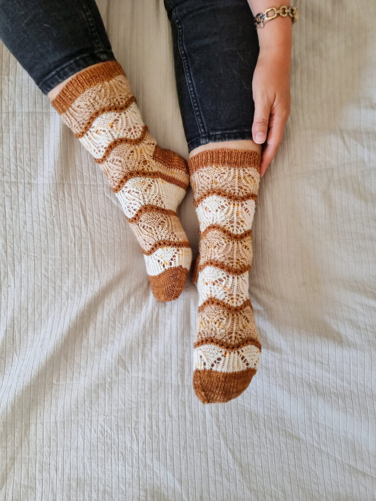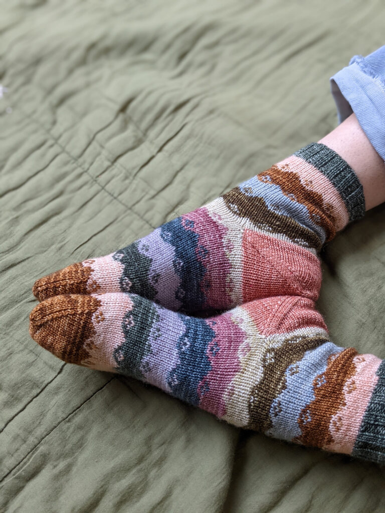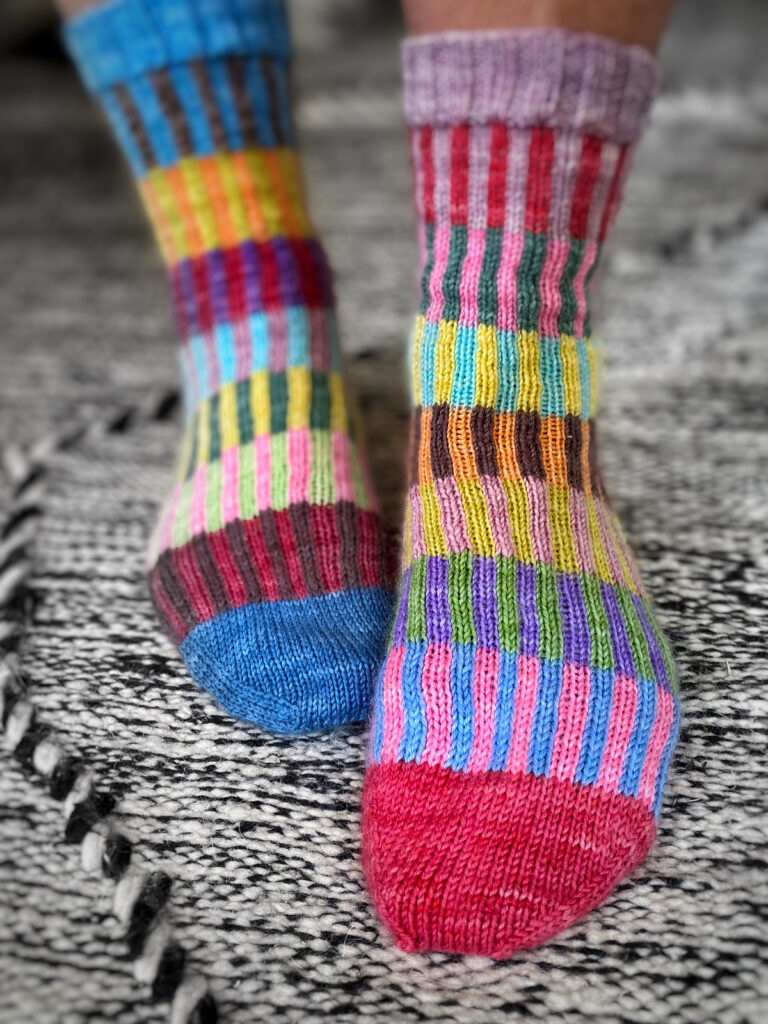 Zaujalo mě, že designérka Sari Nordlund pořádá ponožkový KAL a dopředu počítá s tím, jak se využijí zbytky. Když s ní pletete všechny páry ponožek, zbytky vám vystačí na poslední pár! Takhle vznikly ponožky Storsand Socks, ale podobné s názvem Color Palette Socks navrhla například i designérka Laura Mooratz.