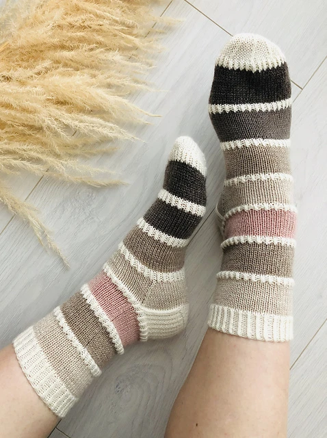 Nejjednodušší je vzít oblíbený návod na obyčejné ponožky a improvizovat. Můžete udělat proužky, barvy střídat ve větších blocích nebo jen začít tenkou linkou u lemu.