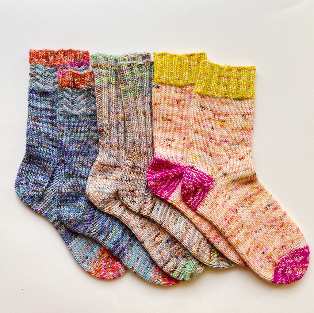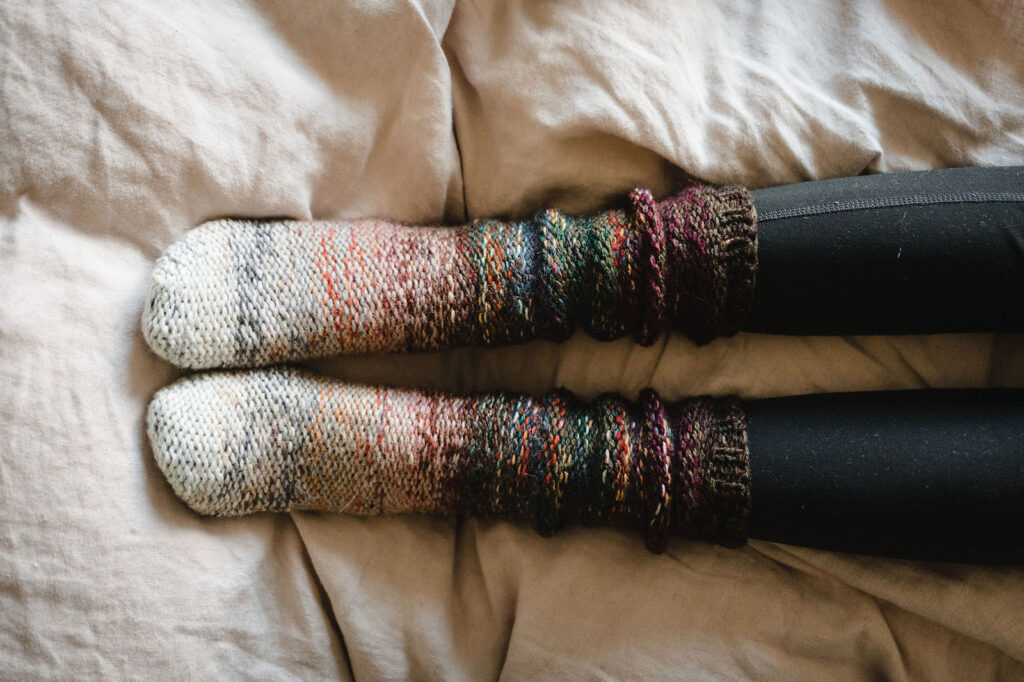 Nejjednodušší způsob, jak se zbavit zbytků, je melír. Ponožková příze je většinou tenká, takže ji stačí držet dvojitě a vzít tlustší jehlice. Pak můžete plést podle jakéhokoliv návodu na tlusté ponožky a měnit příze, kdykoliv se vám bude chtít. Můžete barvy střídat po sekcích jako Thicksgiving Socks od Summer Lee, nebo vytvořit jemný přechod jako u Scrapsody Socks od Winter’s Weather Knits.