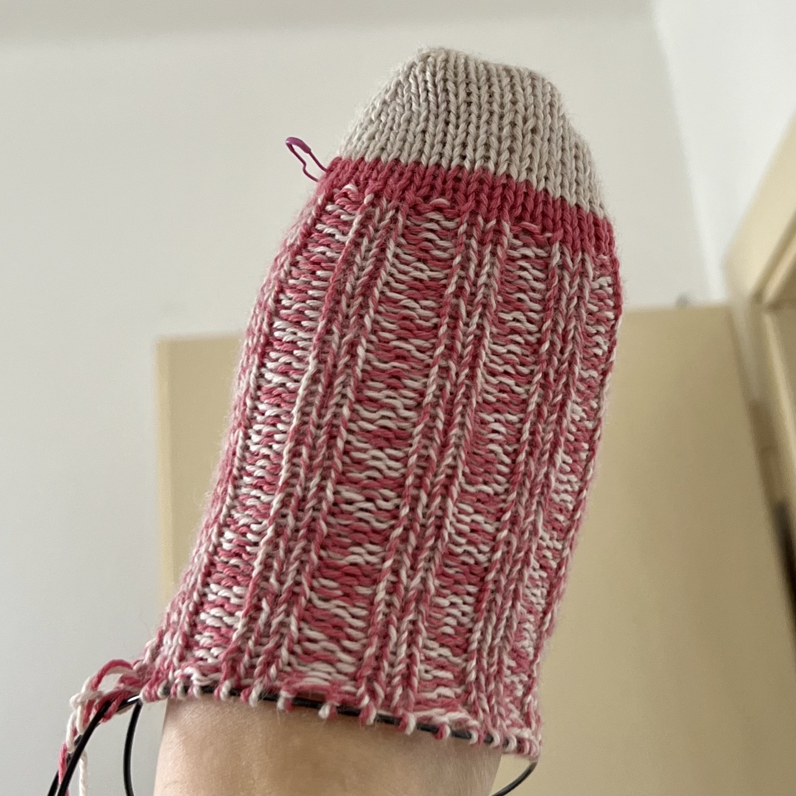 Růžovku jsem spotřebovala úplně. Bála jsem se, že mi nevystačí, tak jsem se pro jistotu rozhodla uplést patu druhé ponožky světlou. A dobře jsem udělala! Konec jsem pletla po kouskách ze zbytků. Naštěstí mi příze vyšla, jen jsem zapošívala víc konců. Je to jediná věc, kde jsem se odchýlila od návodu. Andrea má obě paty stejně barevné.