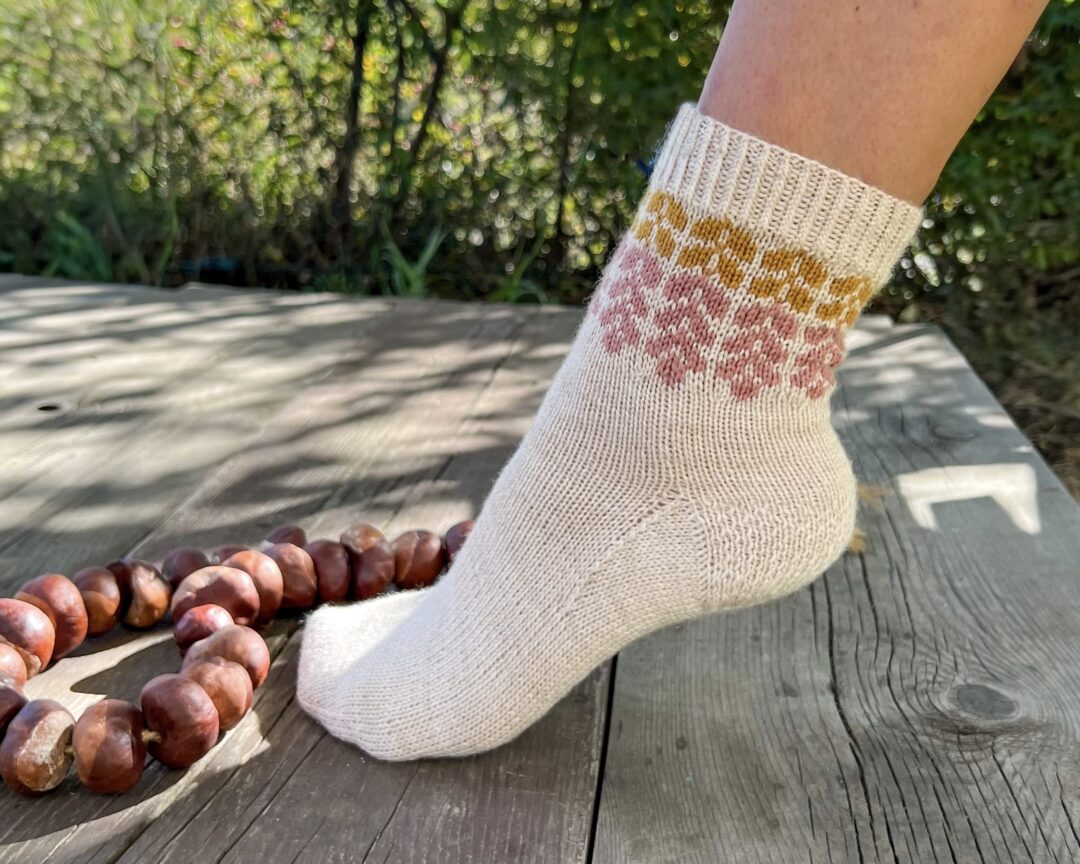 Tenhle design mi dal zabrat. Vymyslela jsem aspoň pět variant, objednala hromadu klubíček, rozpletla dvoje ponožky, a pak se vrátila k úplně první verzi. Má docela jednoduchou konstrukci a využívá tří barev – jedné základní a dvou kontrastních na květiny. Vyplétání není moc složité, jen v pár řadách je delší úsek, u kterého je třeba zachytit v rubu druhou přízi.