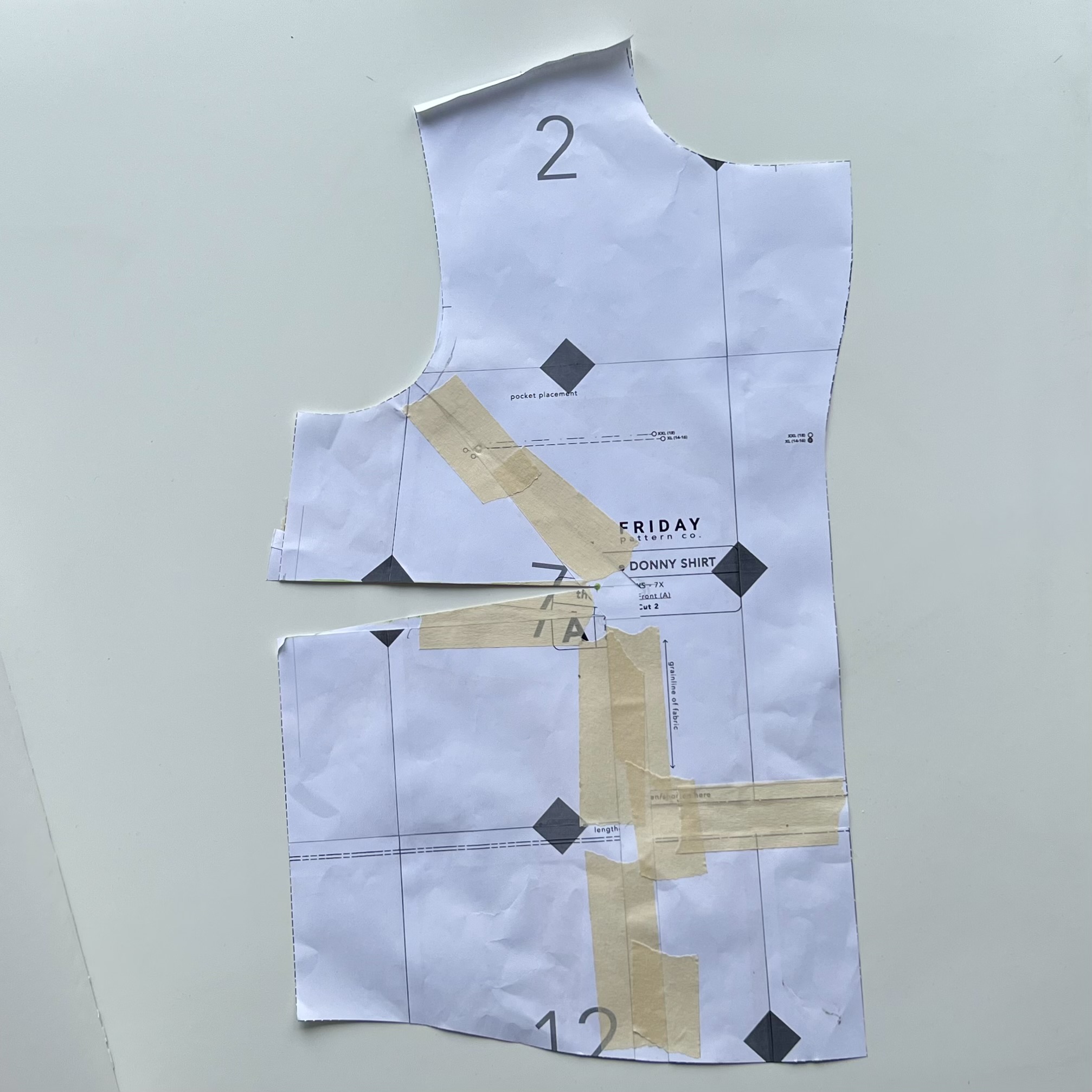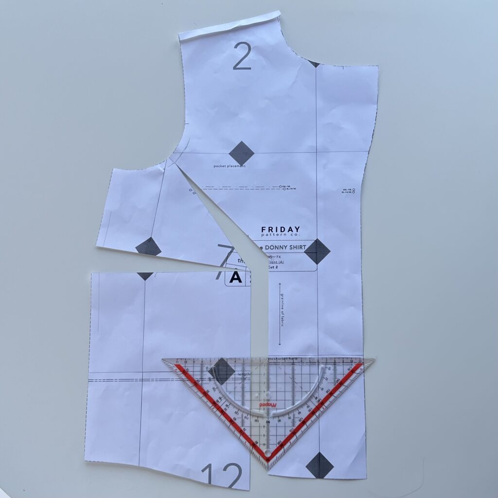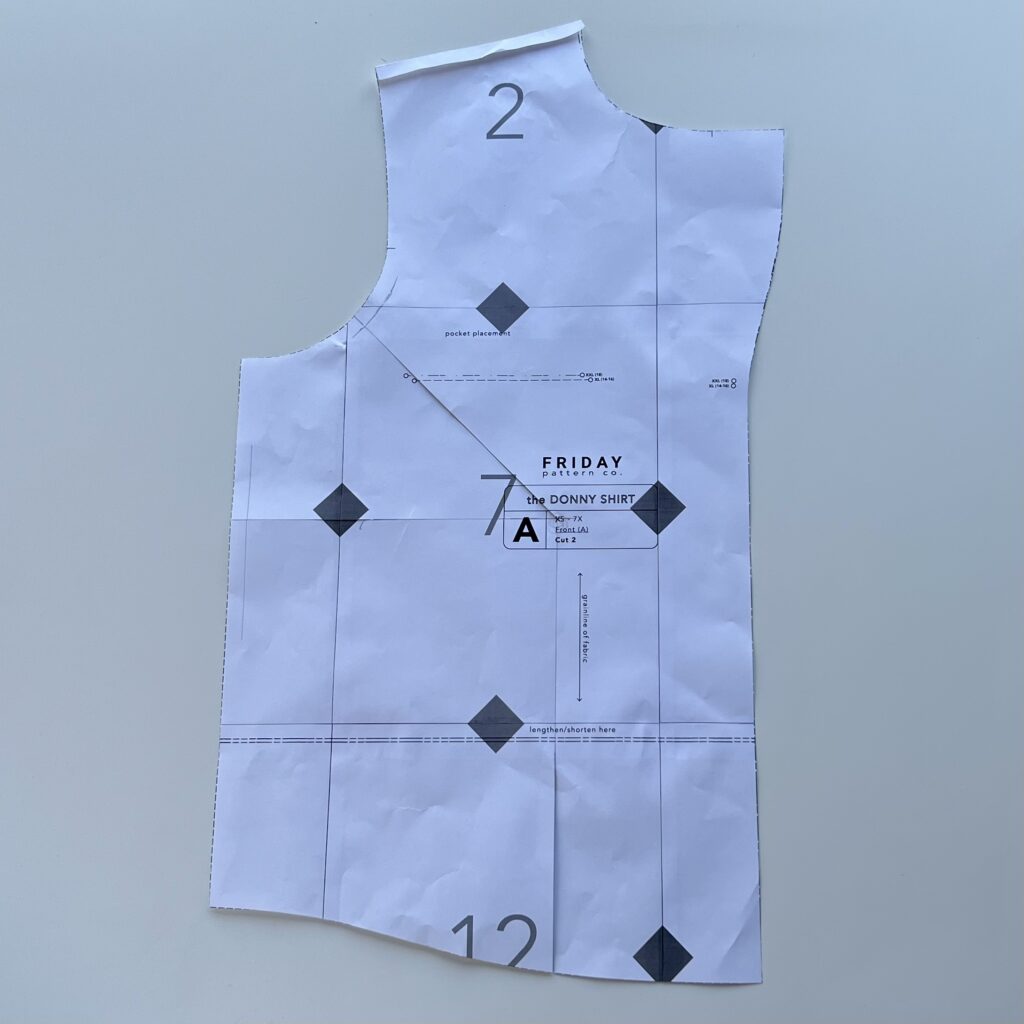 Košile Donny má volný střih, véčkový výstřih s límečkem, ale nemá knoflíkovou légu a obléká se přes hlavu. Ve skupině jsme se shodli, že střihu chybí záševky. Podle mých zkušeností, když nemáte velikost 38 a malá prsa, záševky vylepší každý střih. Tak jsem je do střihu narýsovala podle návodu na stránce Helen’s Closet.