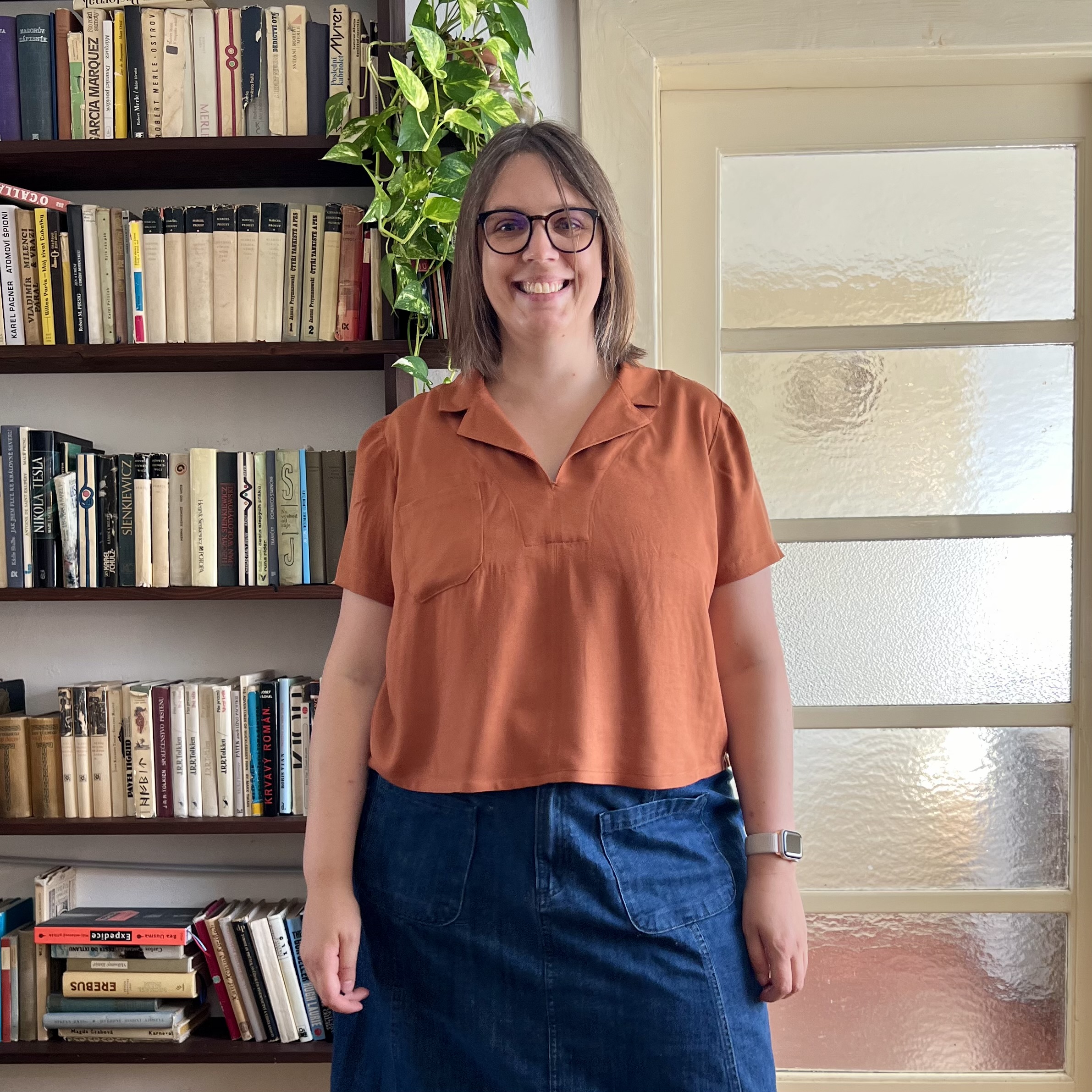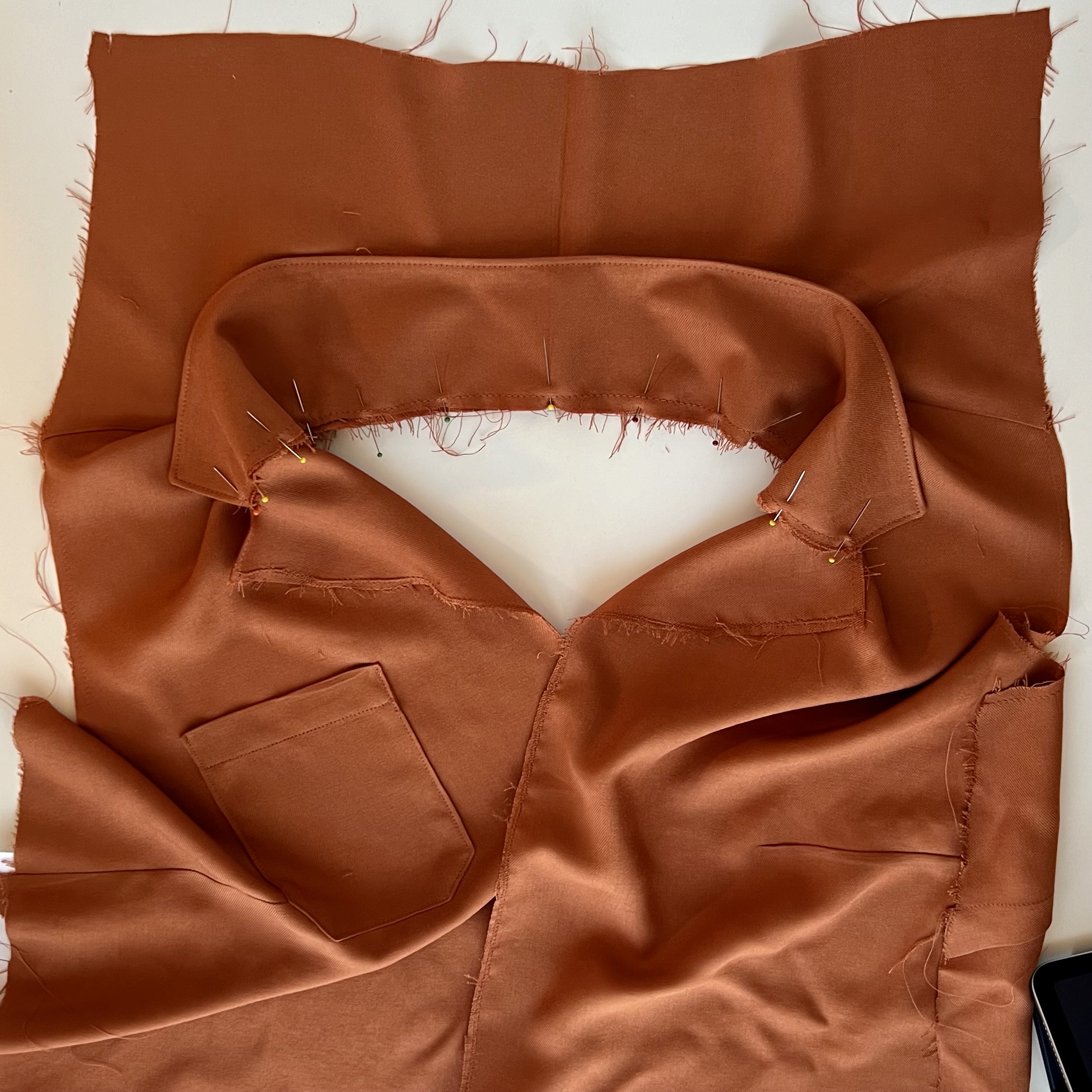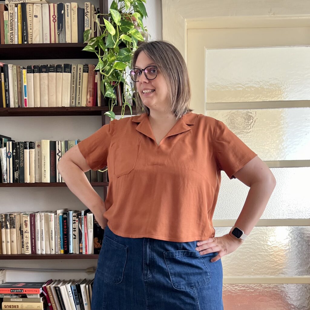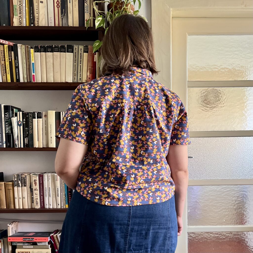 Ráda nosím tenhle druh límečku (nevím, jak se mu říká česky, anglicky je to camp collar). Cítím se v něm dobře a není tak složitý na ušití jako klasický košilový límeček. Celkově se střih šil dobře. Nemá knoflíky, rukávy se vsazují před sešitím bočních švů… Víc už by to asi zjednodušit nešlo. 🙂