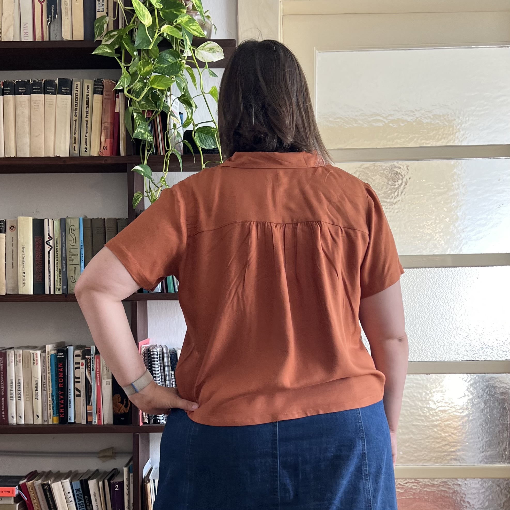 Druhý model košile jsem šila z viskózového kepru, který jsem si přivezla z Londýna. Krásně splývá, má nádhernou matnou karamelovou barvu, ale taky se hýbe a třepí jak čert. Aspoň, že neklouže! Měla jsem co dělat, abych díly vůbec nastřihla ve správném tvaru. Nebudu lhát, rovná čára se mi nepovedla snad ani jedna. Naštěstí to na výsledku není moc vidět.