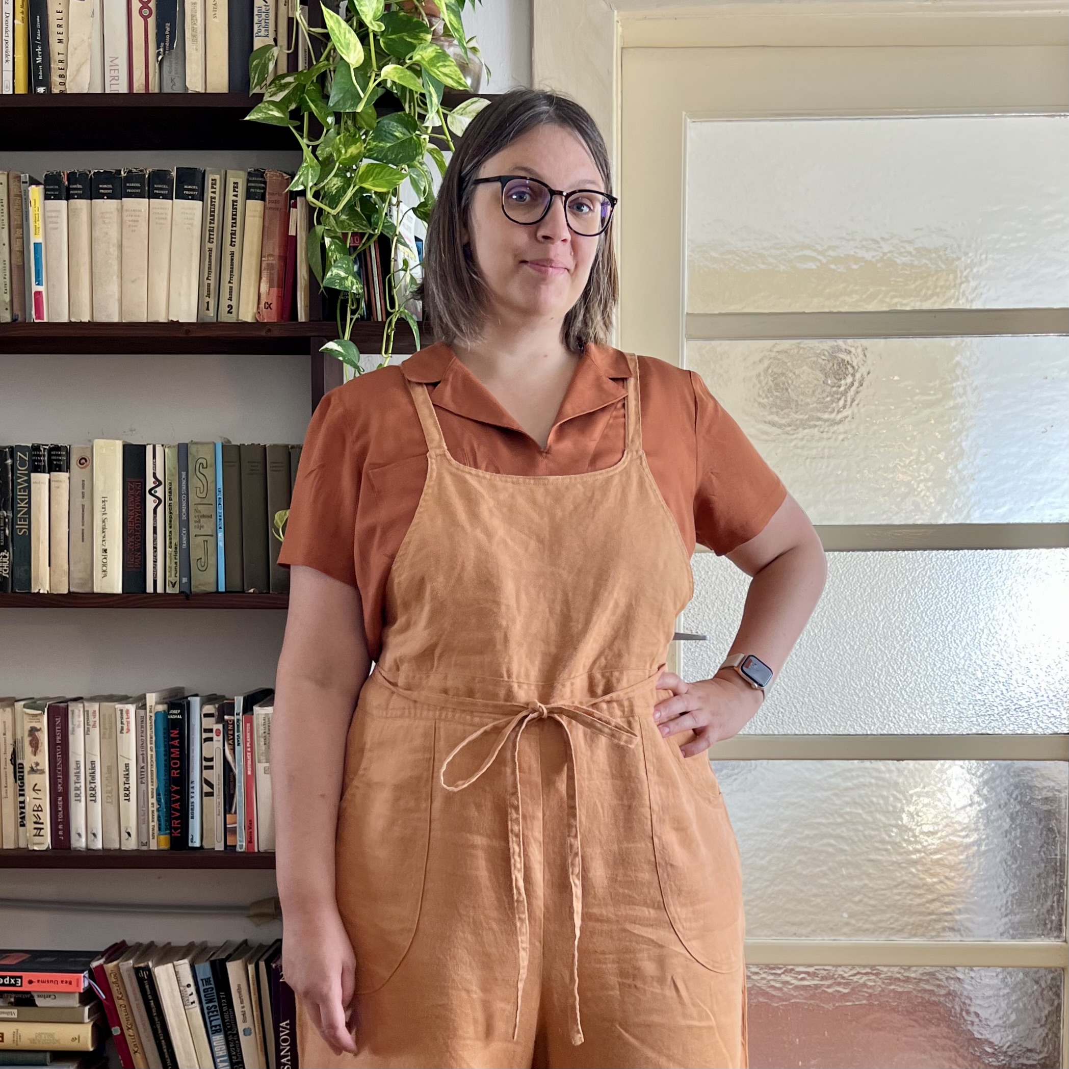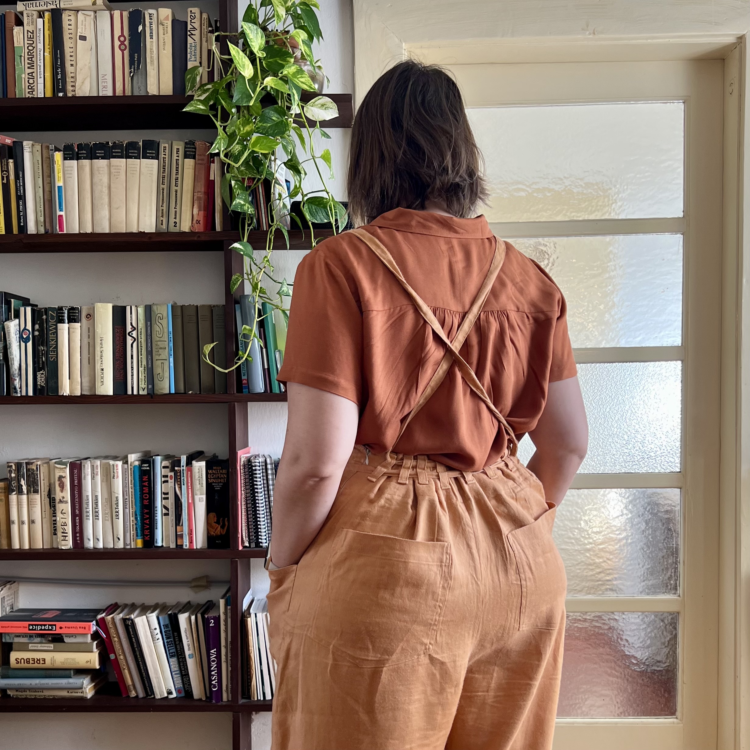 Košile se skvěle hodí ke lněným kalhotám s laclem podle střihu Burnside Bibs značky Sew House Seven. Ty pro mě ušila moje skvělá tchyně v době, kdy jsem nemohla pořádně ani sedět, natož šít.